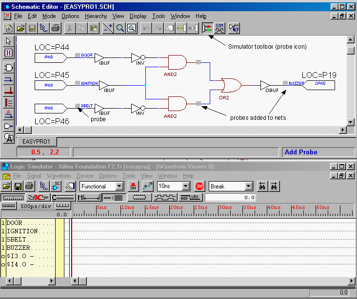Figure 5: Results of the simulation shown in the Simulator and Schematic windows.(Screen clip from Xilinx (TM) Foundation software)
