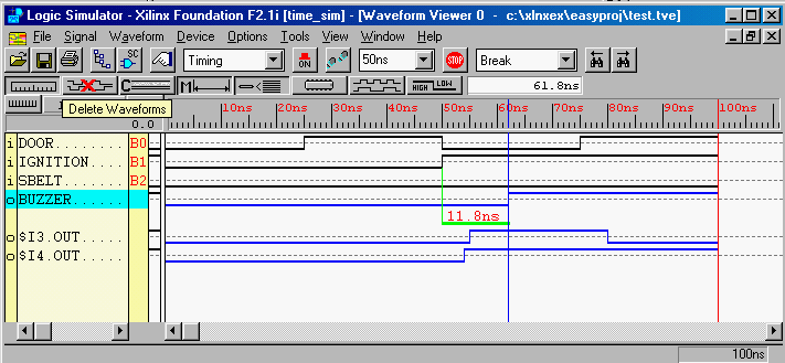 It is clear from the timing diagram that the total delay of 11.8ns is the result of a delay of 1.1ns through the input buffer (IBUF), 3.8ns through the AND gate and 6.9ns through the output buffer (OBUF). One also notices that there is not delay associated with the inverters or the OR gates. This is because the compiler optimized the circuit and trimmed the inverters. The overall circuit operation is of course the same as the original one but the way it is implemented is different. One should realize that logic circuits are implemented on a FPGA by look-up tables instead of gates. A list of removed logic can be found in the Map report of the Implementation Reports Files.