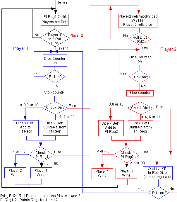 Since two dice are used, the sum will be between 2 and 12. The value of the dice can be generated by two independent counters who count between 1 and 6, or by a single counter who counts between 2 and 12. Each player has it own pushbutton (Roll Dice Rd1 and Rd2 for player 1 and 2, respectively) to roll the dice. The counter starts when a push button, Rd1 or Rd2 (Roll dice) is pressed and continues counting until the button is released. The clock used for the counter has a high frequency so that one cannot see the value of the counters when the push button is pressed. The number that the counter displays when the button is released is the value of the dice and will determine the outcome of the throw according to the rules given above.