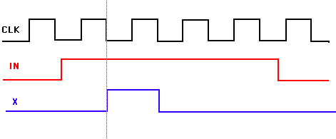 Figure 1: Timing diagram: signal IN is generated asynchronously while signal X is a pulse that is in sync with the clock signal and lasts for only one clock period.