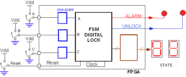 The goal is to implement, download, display and test the digital lock whose block diagram is shown in Figure 2. During the first task you will design and simulate  the finite state machines of  the digital lock and the synchronization (one-pulse) circuit. You will also design and simulate the debouncing circuit. As part of the second task, you will complete the top level schematic, simulate, and debug the overall circuit. Finally, you need to compile (implement) and download the  circuit on an FPGA or CPLD and test its operation. A demo needs to be given to the lab instructors..