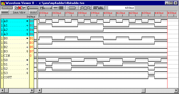 Figure 3: Simulation window of the 4-bit adder with the buses flattened (Screen clip from Xilinx (TM) Foundation software).