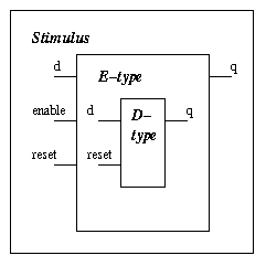 Ports provide a means for a module to communicate through input and output. Let us go back to the E-type flip flop example given in the previous section. The input/ ouput of the D-type relative to the E-type is shown below.