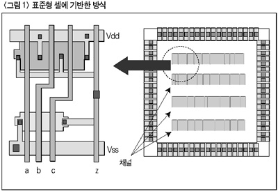 ¸ÕÀú ¿ÏÀü ÁÖ¹®Çü(Full-Custom) ¹æ½ÄÀÌ´Ù. ÀÌ´Â ÈçÈ÷ »ç¿ëÀÚÀÇ ¿ä±¸·Î ´ëº¯µÇ´Â ÁÖ¹®(order)°ú´Â º°°³·Î Á¦À۵Ǵ ¹ü¿ë ¸Þ¸ð¸®³ª CPU, Áï ÀÏ¹Ý ¸ñÀû¿ëÀ¸·Î »ç¿ëµÇ´Â Ĩµé°ú´Â »ó´ëÀûÀÎ °³³äÀÌ´Ù. ¿ÏÀü ÁÖ¹®Çü ¹æ½ÄÀº ±¸ÇöÇϰíÀÚ ÇÏ´Â IC ȸ·Î¸¦ CAD ÅøÀ» »ç¿ëÇØ Á÷Á¢ ¼³°è, ¿þÀÌÆÛ °¡°ø, °ËÁõ µîÀÇ ´Ü°è¿¡ À̸£±â±îÁö ·¹À̾ƿô µµ¸éÀ» Á÷Á¢ µðÀÚÀÎÇØ¾ß Çϱ⠶§¹®¿¡ µðÀÚÀÎ ±â°£ÀÌ ¸¹ÀÌ °É¸°´Ù. ƯÈ÷ º¸´Ù ÃÖÀûÈµÈ È¸·ÎÀÇ ±¸ÇöÀ» À§Çؼ Æ®·£Áö½ºÅÍ ´ÜÀ§·Î±îÁöÀÇ ¼³°è°¡ ÀÌ·ïÁö±â ¶§¹®¿¡ ¹ÝµµÃ¼ Ĩ ¼³°è¿¡ ´ëÇÑ °íµµÀÇ Àü¹®°¡°¡ ÇÊ¿ä½Ã µÇ´Â ºÐ¾ßÀ̱⵵ ÇÏ´Ù. ÇÏÁö¸¸ Ĩ Á¦Á¶ÀÇ Ã³À½ ´Ü°èºÎÅÍ ½ÃÀÛÇØ ¸ðµç ´Ü°è¸¦ Á÷Á¢ ¼³°èÇϱ⠶§¹®¿¡ ÃÖÀûȰ¡ °¡Àå Àß µÇ¾î ÀÖ´Â ÇüÅÂÀ̱⵵ ÇÏ´Ù. Áï, °¡Àå ÀûÀº ¸éÀûÀ¸·Î °¡Àå ¸¹Àº ¼ÒÀÚ¸¦ ÁýÀû½Ãų ¼ö ÀÖ°í µû¶ó¼ ĨÀÇ ´ë·® »ý»ê½Ã °¡Àå ½Ñ °¡°Ý¿¡ °¡Àå ºü¸¥ µ¿ÀÛ ¼Óµµ¸¦ º¸ÀåÇÒ ¼ö ÀÖ´Ù. Ãʱâ ÅõÀÚ ºñ¿ë¸¸ °¨¼Ò½Ãų ¼ö ÀÖ´Ù¸é ´ë·® »ý»êÀ» À§ÇÑ ¹æ½ÄÀ¸·Î´Â °¡Àå ÀûÇÕÇÑ ¹æ½ÄÀ̶ó ÇÒ ¼ö ÀÖ´Ù.