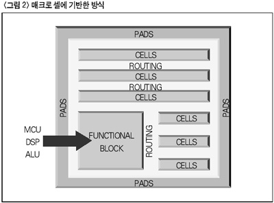 Ç¥ÁØÇü ¼¿ ±â¹Ý ¹æ½ÄÀº ±âº»ÀûÀ¸·Î ÀÌ·¯ÇÑ ¼¿µé·Î ±¸¼ºµÇ¾î ÀÖ°í »óÈ£ ¿¬°áµÇÁö ¾ÊÀº °æ°è ¿µ¿ªµé·Î ÀÌ·ïÁ® ÀÖÁö¸¸ ÀÌ·± ¼¿ ±¸Á¶ ¿ª½Ã °£´ÜÇÑ ALU¿Í ROM µîÀÇ Á¸Àç ¿©ºÎ¿¡ µû¶ó¼ Ç¥ÁØÇü ¼¿(PolyCell) ¹æ½Ä°ú ¸ÅÅ©·Î ¼¿(MarcoCell) ¹æ½ÄÀ̶õ ¿ë¾î¸¦ »ç¿ëÇØ Àç ±¸ºÐµÇ±âµµ ÇÑ´Ù. Ç¥ÁØÇü ¼¿ ¹æ½ÄÀº <±×¸² 1>°ú °°Àº ÇüŶó ÇÒ ¼ö ÀÖÀ¸¸ç ¸ÅÅ©·Î ¼¿ ¹æ½ÄÀº <±×¸² 2>¿¡ ³ªÅ¸³ª ÀÖ´Ù. I/OÇɵéÀ» ¸ÊÇνÃų ÆÐµå ºÎºÐ°ú, ¹Ì¸® ¸¸µé¾îÁ® ÀÖ´Â ¼¿, ±×¸®°í À̸¦ ¿¬°á½Ãų ¶ó¿ìÆÃ ¿µ¿ª À̿ܿ¡ º°µµ·Î ±â´É ºí·°À̶õ °ÍÀÌ Á¸ÀçÇÑ´Ù. Ĩ ³»¿¡ Á¸ÀçÇÏ´Â ¼ºê ¸ðµâÀ̶ó ÇÒ ¼ö ÀÖ´Ù. °£´ÜÇÑ Á¦¾î À¯´ÖÀ̳ª ROM µîÀÌ ÀÌ·¯ÇÑ ¼ºê ¸ðµâ·Î Á¸ÀçÇÒ ¼ö ÀÖ´Ù.