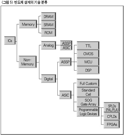 <±×¸² 5>¸¦ º¸¸é ÁýÀû ȸ·Î, Áï IC´Â ¸Þ¸ð¸®¿Í ºñ ¸Þ¸ð¸® ºÐ¾ß·Î ³ª´¸À» ¾Ë ¼ö ÀÖ´Ù. ÁÖÁöÇÏ´Ù½ÃÇÇ ¿ì¸® ³ª¶ó´Â ÀÚ¶û½º·´°Ôµµ ¸Þ¸ð¸® ºÐ¾ß, ƯÈ÷ DRAM ºÐ¾ß¿¡¼ ¼¼°è ÃÖ°í¸¦ ÀÚ¶ûÇÑ´Ù. ±×¸®°í ¶Ç ÇϳªÀÇ Å« ºÐ·ùÀÎ ºñ ¸Þ¸ð¸® ºÐ¾ß°¡ Á¸ÀçÇÑ´Ù. ºñ ¸Þ¸ð¸® ºÐ¾ß´Â ´Ù½Ã ¾Æ³¯·Î±×¿Í µðÁöÅÐ ½Ã½ºÅÛÀ¸·Î ±¸ºÐµÇ¸ç µðÁöÅÐ ½Ã½ºÅÛ ºÐ¾ß·Î ³»·Á¿À¸é ASIC, PLD, FPGA µîÀÌ ºÐ·ù»ó¿¡ Á¸ÀçÇÔÀ» ¾Ë ¼ö ÀÖ´Ù.
