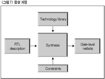 Áï ÀÛ¼ºÇÑ ÄÚµùÀ» ³í¸®ÀûÀ¸·Î ÇÕ¼º½ÃŰ´Â VHDL ÅøÀº VHDL·Î ÇÁ·Î±×·¥µÈ ³í¸®±â´ÉÀ» ½ÇÁ¦ °ÔÀÌÆ® ȸ·Î·Î º¯È¯ÇÏ´Â ¿ªÇÒÀ» ÇÑ´Ù. ÀÌ·¯ÇÑ ³í¸®ÇÕ¼º¿¡ ÀÇÇØ »ý¼ºµÈ Ãâ·Â °á°ú¹°Àº ¸¸µé°íÀÚ ÇÏ´Â ASICÀÇ ³×Æ®¸®½ºÆ®(netlist)°¡ µÈ´Ù. ³×Æ®¸®½ºÆ®¶õ ´Ü¼øÈ÷ ȸ·Î ºÎǰÀÇ Á¢¼Ó°ü°è¸¦ ÅØ½ºÆ® ÇüÅ·ΠǥÇöÇÑ °ÍÀ» ¸»ÇÑ´Ù. ÀÌ·¯ÇÑ ³×Æ®¸®½ºÆ® ÆÄÀÏÀÌ VHDLÀ» ÀÌ¿ëÇÑ »óÀ§ ·¹º§ÀÇ µðÀÚÀÎÀ» ÇÏÀ§ ·¹º§ÀÇ ½ÇÁúÀûÀÎ ºÎǰµé°ú ¿¬°ü Áö¾îÁÖ´Â ´Ù¸® ¿ªÇÒÀ» ÇÏ´Â °ÍÀÌ´Ù. <±×¸² 7>¿¡ ÇÕ¼º °úÁ¤ÀÌ ³ªÅ¸³ª ÀÖ´Ù. Âü°íÇϱ⠹ٶõ´Ù.