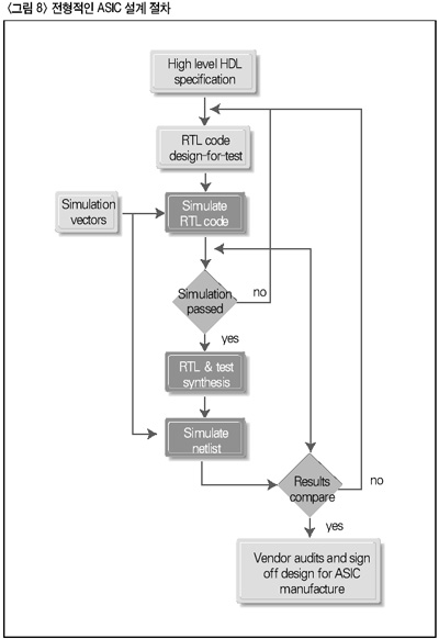 <±×¸² 8>¿¡¼ ÀüÇüÀûÀÎ ASIC ¼³°è ÀýÂ÷µéÀÌ ¿ä¾àµÇ¾î ÀÖ´Ù. ¾Õ¼ ¸»ÇÑ 3´Ü°èÀÇ ¿ëµµ¿Í °°ÀÌ ºñ±³ÇØ »ìÆìº¸±â ¹Ù¶õ´Ù. ¿ì¼± ÀýÂ÷Àû Çü½ÄÀ¸·Î ÀÛ¼ºµÈ HDL Äڵ带 ±â´ÉÀû Çü½ÄÀ¸·ÎÀÇ ·¹Áö½ºÅͳª °ÔÀÌÆ® ·¹º§ÀÇ RTL(Register Transfer Level) ÄÚµå·Î º¯È¯À» ¼öÇàÇÑ´Ù. ±×¸®°í ³ ÈÄ À̸¦ ½Ã¹Ä·¹ÀÌ¼Ç ´Ü°è¸¦ °ÅÃļ ÇÁ·Î±×·¥ÀÇ ¹«°á¼ºÀ» °ËÁõÇÑ´Ù. ±× ÈÄ ÇÕ¼º °úÁ¤À» °ÅÃÄ À̸¦ ´Ù½Ã ƯÁ¤ ASIC ¾÷ü¿¡¼ Á¦°øÇÏ´Â ¶óÀ̺귯¸®·Î ¸ÊÇÎÇÏ´Â °úÁ¤À» °ÅÄ£´Ù. ƯÈ÷ ½Ã¹Ä·¹À̼ÇÀº RTL ÄÚµå ·¹º§¿¡¼ÀÇ ½Ã¹Ä·¹À̼ÇÀÌ ÀÖ°í, ³×Æ®¸®½ºÆ® ·¹º§¿¡ ´ëÇÑ ½Ã¹Ä·¹À̼ÇÀÌ ÀÖ´Ù. ÀÌ´Â ´Ü¼øÈ÷ Çϵå¿þ¾î ±â¼ú ¾ð¾î ·¹º§ÀÇ ½Ã¹Ä·¹À̼ÇÀÌ³Ä ¾Æ´Ï¸é ƯÁ¤ ASIC ¾÷ü Á¦Ç°ÀÇ È¸·Î»ó µô·¹À̰¡ ¹Ý¿µµÈ ±â¼ú Á¾¼ÓÀû(technology dependant)ÀÎ ½Ã¹Ä·¹À̼ÇÀ̳ÄÀÇ Â÷ÀÌ¿¡ µû¸¥ °ÍÀ̸ç, ÀüüÀûÀ¸·Î º¼ ¶§ Ư¼ºÀÌ ´Ù¸¥ µÎ ¹øÀÇ ½Ã¹Ä·¹ÀÌ¼Ç °úÁ¤À» °ÅÄ¡´Â °ÍÀÌ µÈ´Ù. À̰ÍÀÌ ÀϹÝÀûÀÎ ASICÀÇ ¼³°è ÀýÂ÷ÀÌ´Ù.