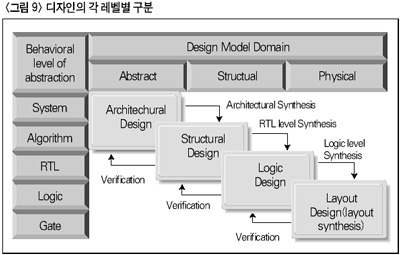 <±×¸² 9>¿¡¼ º¸µíÀÌ Ãß»óÈÀÇ ´Ü°è¿¡´Â Å©°Ô 5°èÃþÀÌ Á¸ÀçÇÑ´Ù. »ç½Ç»ó ÀÌÀÇ ºÐ·ù¿¡´Â ¸íÈ®ÇÑ ±âÁØÀÌ ÀÖ´Â °ÍÀº ¾Æ´Ï°í »ç½Ç ±× °æ°èµµ ¾Ö¸ÅÇÏ´Ù. ±×·¯³ª ÇöÀç ³Î¸® »ç¿ëµÇ°í ÀÖ´Â ¿ë¾îµéÀ̱⠶§¹®¿¡ °³³äÀûÀ¸·Î ÀÌÇØÇϱ⠹ٶõ´Ù. ½Ã½ºÅÛ ·¹º§Àº °¡Àå Ãß»óÈ Á¤µµ°¡ ³ôÀº ·¹º§ÀÌ´Ù. CPUÀÇ ÆÄÀÌÇÁ ¶óÀÎÀ̳ª ij½Ã µî ½Ã½ºÅÛ ³»ÀÇ ±â´ÉÀ» Ç¥ÇöÇÑ ·¹º§ÀÌ´Ù. ´ÙÀ½À¸·Î ¾Ë°í¸®Áò ·¹º§Àº µ¿ÀÛÀû ·¹º§À̶ó°íµµ Çϴµ¥ ¿©±â¼´Â ȸ·ÎÀÇ µ¿ÀÛÀ̳ª ¿òÁ÷ÀÓÀ» Ç¥ÇöÇÏ´Â ·¹º§ÀÌ´Ù. ȸ·Î¿¡¼ ºí·°À̶ó´Â °³³äÀº ÇöÀç ÀÌ ·¹º§¿¡¼´Â Á¸ÀçÇÏÁö ¾ÊÀ¸¸ç, ¾Õ¼ ¼³¸íÇÑ ÀýÂ÷Àû ¼³°è ´Ü°è¿¡ ÇØ´çÇÏ´Â ·¹º§ÀÌ´Ù.