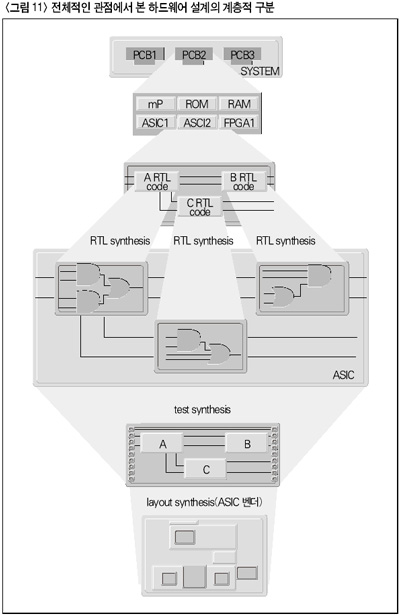 ³¡À¸·Î Áö±Ý±îÁö ³íÇÑ ÁÖÁ¦¿¡ ´ëÇÑ °Å½ÃÀûÀÎ °üÁ¡À» °í·ÁÇØ º¸ÀÚ. ÀÌ¿¡ ´ëÇÑ ¹¦»ç°¡ <±×¸² 11>¿¡ ³ªÅ¸³ª ÀÖ´Ù. ¾î¼¸é Áö±Ý±îÁö ¼³¸íÇϰíÀÚ ÇÑ ¸ðµç °ÍÀÌ ÀÌ ±×¸²¿¡ Ãà¾àµÇ¾ú´Ù°í ÇØµµ °ú¾ðÀÌ ¾Æ´Ò °ÍÀÌ´Ù. ±×¸²ÀÇ º¼·ÏÇÑ °¡¿îµ¥ ºÎºÐºÎÅÍ »ìÆìº¸ÀÚ. °¡¿îµ¥ ºÎºÐÀÇ °ÔÀÌÆ®´Â ¿ì¸®°¡ ¿øÇÏ´Â µ¿ÀÛÀ» ¼öÇàÅä·Ï ÀÛ¼ºÇÑ È¸·Îµµ¸¦ ÀǹÌÇÑ´Ù. ±×¸®°í ¿ì¸®´Â ÀÌ·¯ÇÑ È¸·Îµµ¸¦ Çϵå¿þ¾î ±â¼ú ¾ð¾î¶ó´Â °ÍÀ» ÀÌ¿ëÇØ ±¸ÇöÇÏÀÚ°í ÇÏ¿´´Ù. ÀÌ·¸°Ô ÀÛ¼ºµÈ ȸ·Îµµ´Â ÇÕ¼ºÀÇ Àü ó¸® °úÁ¤ÀÎ RTL ÇÕ¼º °úÁ¤À» °ÅÃļ ±¸Á¶Àû µðÀÚÀÎÀÇ ÇüÅÂÀÎ RTL ÄÚµå·Î º¯È¯µÈ´Ù. ÀÌ RTL ÄÚµå´Â ½ÇÁ¦ ÇÕ¼º ´Ü°è¸¦ °ÅÃļ ASIC ȤÀº FPGA ÇüÅ·Π±¸ÇöµÈ´Ù. ±×¸®°í ÀÌ·¸°Ô ±¸ÇöµÈ ASIC ȤÀº FPGAµéÀº ÀÏ¹Ý ¸ñÀû¿ë ¸ðµâµé, Áï CPU³ª ¸Þ¸ð¸®µî°ú ÇÔ²² PCB¿¡ ºÎÂøµÇ¾î ±¸ÇöµÈ´Ù. Áï Çϵå¿þ¾î ±â¼ú ¾ð¾î¿¡¼ ½ÃÀÛÇÑ Á¦ÀÛ °úÁ¤ÀÌ PCB º¸µåÀÇ ÇüÅ·ΠÃÖÁ¾ »ê¹°ÀÌ ³ª¿À´Â °ÍÀÌ´Ù. ±×¸²ÀÇ º¼·ÏÇÑ ºÎºÐÀÇ ¾Æ·§ºÎºÐ ¿ª½Ã °¢ ȸ·ÎÀÇ ½ÇÁúÀûÀÎ ±¸ÇöÀ̶ó ÇÒ ¼ö ÀÖÀ» °ÍÀÌ´Ù. Áï ¿ì¸®°¡ ±¸ÇöÇϰíÀÚ ÇÏ´Â °ÔÀÌÆ® ȤÀº ·¹Áö½ºÅ͵éÀÇ Á¾·ù´Â ¿ì¸®°¡ ¼±ÅÃÇÑ Æ¯Á¤ Çϵå¿þ¾î ¾÷üº°·Î ´Ù¾ç¼ºÀ» °¡Áú ¼ö ÀÖÀ» °ÍÀ̰í ÀÌ¿¡ µû¶ó ¾à°£¾¿ ±× ·¹À̾ƿôÀÌ ´Þ¶óÁú ¼ö ÀÖ´Ù. ±×¸®°í °¢°¢ÀÇ °ÔÀÌÆ®, ·¹Áö½ºÅ͵éÀº ½ÇÁ¦ ¹°¸®ÀûÀ¸·Î MOS ȤÀº Æ®·£Áö½ºÅÍ È¸·ÎÀÇ ÇüÅ·Π±¸ÇöµÇ¾î Áú °ÍÀÌ´Ù.