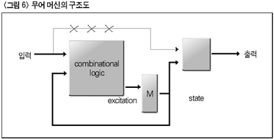 ½ºÅ×ÀÌÆ® ¸Ó½ÅÀÇ ¶Ç ÇϳªÀÇ ±¸Çö ¹æ¹ýÀ¸·Î ¹«¾î ¸Ó½Å(moore machine)ÀÌ ÀÖ´Ù. ÀÌ´Â <±×¸² 6>¿¡¼ º¸´Â ¹Ù¿Í °°ÀÌ Ãâ·Â ÇÔ¼ö°¡ ÇöÀçÀÇ »óŸ¸À» ÀÔ·ÂÀ¸·Î ÇÑ´Ù. µû¶ó¼ ÇÑ °³ÀÇ »óÅ¿¡ ´ëÇØ¼ ÇÑ °³ÀÇ Ãâ·Â¸¸À» °®´Â´Ù. ÀÌ´Â ¹Ð¸® ¸Ó½Å¿¡ ºñÇØ »óżö°¡ »ó´ëÀûÀ¸·Î Áõ°¡ÇÏ´Â ´ÜÁ¡ÀÌ ÀÖ±â´Â ÇÏÁö¸¸ ÀÔ·ÂÀÇ ³ëÀÌÁî°¡ Ãâ·Â¿¡ Àü´ÞµÇÁö ¾Ê°í ÀÔ·Â ½ÅÈ£ÀÇ ¿µÇâÀ» ´ÙÀ½ ´Ü¿¡ Àü´ÞÇÏÁö ¾Ê±â ¶§¹®¿¡ ¹Ð¸® ¸Ó½Åº¸´Ù Á»´õ ¾ÈÁ¤ÀûÀÎ µ¿ÀÛÀ» ÇÑ´Ù°í ¸»ÇÒ ¼ö ÀÖ´Ù.