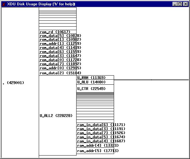 The image below shows the output from the architectural view tool. It can be seen that U_RAM, U_ALU, U_CTR, and the buses for RAM and ROM are the most expensive components. Xdu allows you to explore this hierarchy in much more detail than is shown in the image. (Architectural view tool output displayed in xdu, values are in 1/1000mW) ![]() The table below displays output from the program memory view that is provided by the instruction set simulation tool. For every location in program memory, it displays the address, instruction, frequency of execution, average power, and power * frequency. This view makes it easy to determine which area of the program is the bottleneck in terms of power consumption. (Small sample of program memory view, power is in mW)