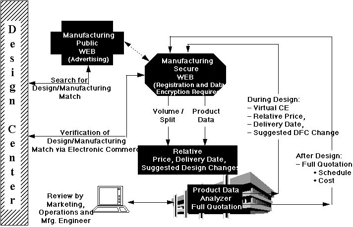 Ultimately, the capabilities embodied in the Manufacturing Interface will enable concurrent engineering in the context of the electronic commerce paradigm. Figure 6.2-4 illustrates how this will be accomplished. The initial design customer contact with the manufacturer takes place via a public World Wide Web (WWW) connection. If further contact is desired the customer registers with the manufacturer and is given access to a secure WWW server. The customer may then transfer design data via secure Internet to the manufacturing site and use a web browser to run the design data against the manufacturer's capabilities. Manufacturing issues and relative pricing are returned to the customer via the secure WWW connection. If additional manufacturing knowledge is required, the customer may request assistance from a manufacturing engineer. Additional iterations of this scenario may be required before a satisfactory design is obtained. When the design is complete, the customer contacts the manufacturing engineer for detailed cost and scheduling information and data verification.