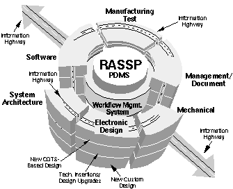 The RASSP Enterprise Framework, summarized in figure 1- 1 was developed by Lockheed Martin Advanced Technology Laboratories (LM-ATL), in collaboration with Intergraph Corporation, Rockwell International Corporation, Mentor Graphics Corporation (MGC) and South Carolina Research Authority (SCRA). It is comprised of an extensive set of tools, all seamlessly integrated with a common desktop environment. At the core of the Enterprise Framework is the Product Data Management System (PDMS). The PDMS configuration manages all of the design data produced during the design cycle of a DSP system, and provides complete file tracking for documentation of the system configuration. Integrated with the PDMS is the Workflow Management System. The Workflow Management. System implements an organization's best design practices as repeatable workflow segments. These workflow segments are stored as templates and are attached to projects at project creation time. The Workflow Management System guides the user through the design process, using a graphical representation of the workflows, ensures that all critical steps in the process are followed, and provides access to the appropriate CAD tools and data at the proper times. The design process can be a simple upgrade to an existing design, a new COTS-based design, or a new custom design.