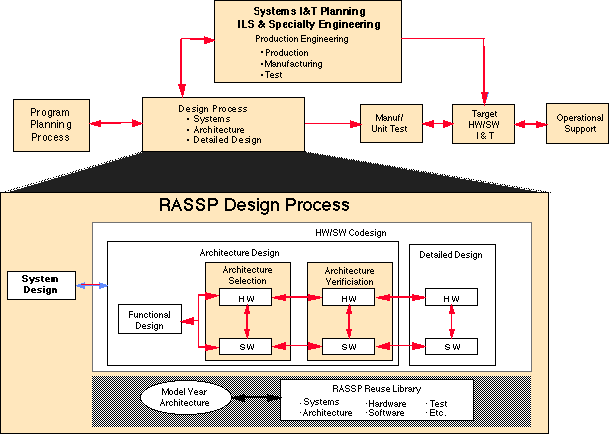 Although the RASSP process fosters maximum reuse of both hardware and software, new software primitives or custom hardware is often required for an application. When custom hardware is required, HW/SW codesign refers to the process of model generation and the verification of the software on the hardware models prior to hardware build. In the case of new software primitives, HW/SW codesign refers to the process of software generation and verification on a hardware testbed or model(s) of the hardware to ensure both function and timing.