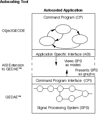 As shown in Figure 3 - 12, the command program views the signal processing system as a collection of modes and submodes, while the signal processing system naturally presents itself as a collection of graphs. Consequently two interfaces are defined. The Command Program Interface (CPI) provides control services built around the signal processing graphical notions. The Application Specific Interface (ASI) provides a view of the signal processing as a collection of modes and submodes. The ASI is a more natural representation for system designers while the CPI is natural to the data flow graph designers. As Figure 3 - 12 illustrates, there is a gap between the two interfaces. An Application Interface Builder (AIB) has been developed by ATL under the RASSP program to generate the Application Specific Interface that fills this gap. The control software developer issues a mode change request via the ASI and the interface software constructed by the AIB will provide the detailed sequence of commands via the CPI to implement the request. The ASI instantiation consists of calls to the CPI based on the specific set of modes / submodes for the application, the set of graphs developed to perform the application, and the correlation between the two sets. The capability of the AIB will be commercialized as part of the GEDAE product.
