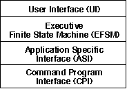 The overall command program is a layered architecture as shown in Figure 3 - 13. The bottom two layers address the data flow graph perspective while the top two layers address the control perspective. The bottom most layer is the Command Program Interface (CPI) layer and consists of the generic set of graph control functions provided by GEDAE. This layer can be viewed as Commercial of the Shelf (COTS) software from the perspective of the command program. The next layer is the Application Specific Interface (ASI) layer. It is generated by the Application Interface Builder (AIB) and provides a high level set of functions used to instantiate, control, and configure a top level graph(s). The next layer up is the Executive Finite State Machine layer that reflects the state of the signal processing application. This layer may reflect a wide range of complexity and may be generated by hand or may require the utilization of a graphical tool such as ObjectGEODE. The User Interface layer may represent a simple interface for testing or may represent a complete interface for the application.