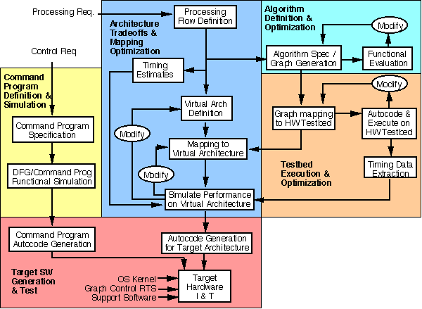 After the top level graphs are captured, command program development proceeds using Verilog's ObjectGEODE tool. The model is simulated with the interface to the actual data flow graphs implemented as a set of smart stubs. A smart stub is a software program which simulates simple responses from the signal processing system. Command program functionality can thus be verified independent from the implementation of the signal processing. Concurrent with the command program development is the detailed definition of the application graphs in GEDAE. The top level graphs are detailed and simulated using GEDAE to establish correct funtionality.