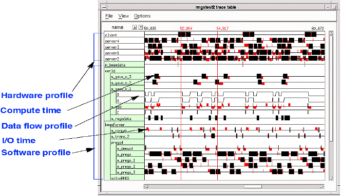 Simulation / Validation - Execution of GEDAE graphs is controlled through the same interface used to construct the graph. Users can modify parameters in the graph on the fly and observe t2he impact of those changes. The ease of making modifications to a graph and its operating parameters increases productivity by making it easy for designers to fine tune applications quickly. Execution results are presented to the designer in the form of detailed timelines and execution schedules along with memory maps to support the designers analysis of system solutions. An annotated example of a trace table is shown in Figure 3 - 8. It contains both a hardware execution profile and a software execution profile. Computation time, data flow activity(buffers filling and emptying), and communication activity are all detailed in the trace table.