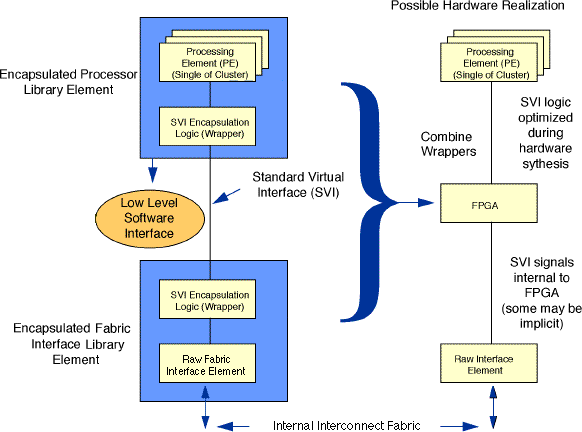 Each library element (node or fabric interface) includes a VHDL wrapper that implements the SVI encapsulation logic. During the hardware implementation, the logic described within the encapsulations from both sides of the SVI is combined and optimized using synthesis tools to the greatest extent possible, This process may cause some of the signals defined for the SVI to become implicit in the remaining logic. What remains of the SVI is embedded within an ASIC, gate array, or FPGA, and would not appear as explicit pins on a chip or interface connector.
