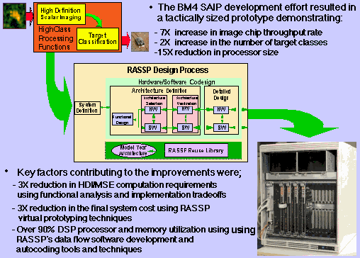 The final BM4 prototype hardware met or exceeded most of the SAIP HighClass processing requirements/goals. The result of the BM4 effort was an all COTS HighClass processor consisting of six VME-6U boards, one less than the proposed seven board solution. While the system only achieved a 25 image chip per second throughput rate, adding a fifth Sharc DSP board would have resulted in a seven board design exceeding the 30 image chip per second requirement. The prototype achieved the 100X throughput density improvement by increasing throughput 7X while reducing the size by more than 15X. In addition, the effort lead to a decrease of 3X in the number of computations required to meet the 30 chips per second processing requirement (reducing the total computation from 18 Gflops to 6 Gflops). The BM4 prototype matched 100% of the executable specification target classification results, performed all of the required HighClass mode control functions, and interfaced directly with the existing SAIP control system. Finally, RASSP' s virtual prototyping techniques led to a design which eliminated the need for a sophisticated interconnect network or external processor memory, resulting in a 3x reduction in the prototype hardware cost.