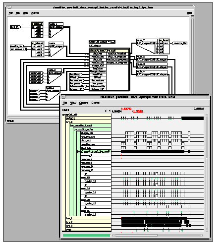 During the Architecture Hardware/Software Architecture Codesign cycle, performance models were used to analyze and validate the hardware/software designs for the FPGA, C80 and C6201 custom board designs. The FPGA custom board virtual prototype was developed using Omniview's Cosmos performance modeling tools, while the C80 and C6201 processor models were developed using in-house lightweight less detailed VHDL models and tools (see Performance Modeling Application Note).