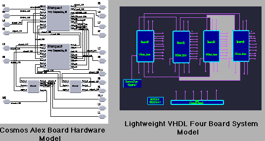 From the simulation runtimes, it is apparent that the simulation code generated by the Cosmos tool is significantly larger and runs slower than the lightweight VHDL models. Cosmos' sophisticated, general purpose models result in large simulation executables and longer runtimes. Comparison of the Cosmos one board model with the two board model show the non linear effect the simulation size had on the simulation runtime. In this case, the size of the two board model exceeded the workstation' s memory limits and significantly diminished the usefulness of the Cosmos tool. On the other hand Cosmos' integrated tools and general purpose model library made assembling and integrating the model relatively simple.