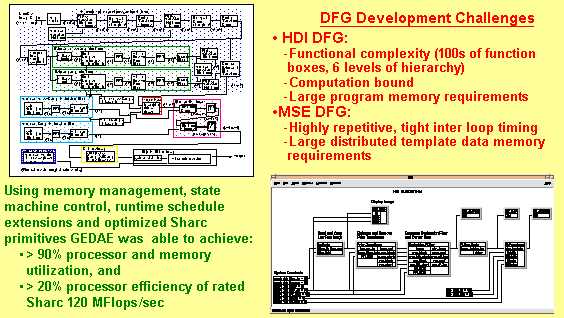 GEDAE™ is a graphical data flow software development tool that allows signal processing software to be captured as DFGs and autocoded for COTS DSP boards. GEDAE™ is a new software tool developed by ATL that had only been introduced as a commercial product in mid 1997. As a result, a number of limitations and shortcomings arose during the HighClass software development. In addition, the DFG software development processes were also immature. The combination of GEDAE™' s shortcomings and the lack of a proven DFG development process resulted in a number of challenges and setbacks in capturing and optimizing the MSE and HDI software.