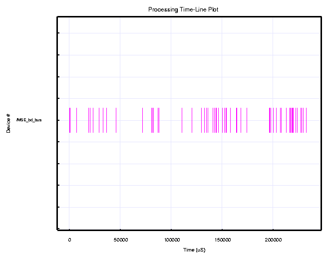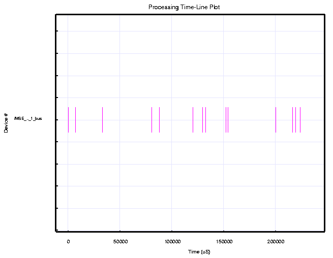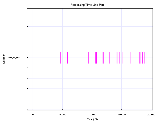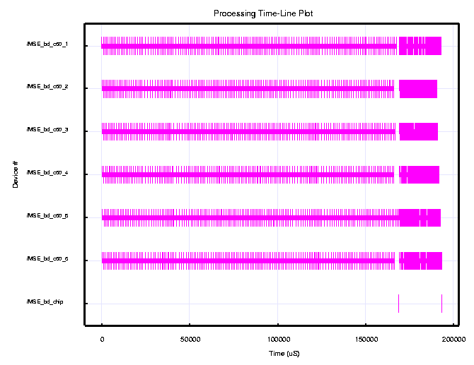 A blow-up of the timeline for the processing of the first image chip by each C6201 is shown in Figure 10. The randomness in the completion times due to different sized templates and statistical early termination is more visible in this figure. Figure 11 shows the bus utilization time for the same period, for the board level bus model.
