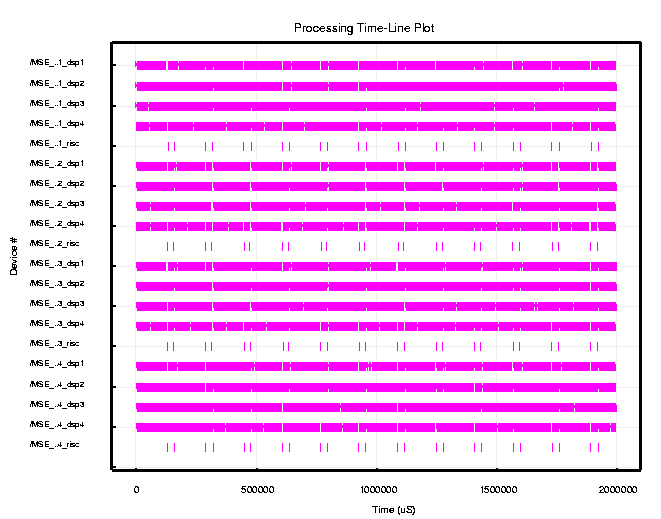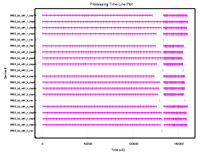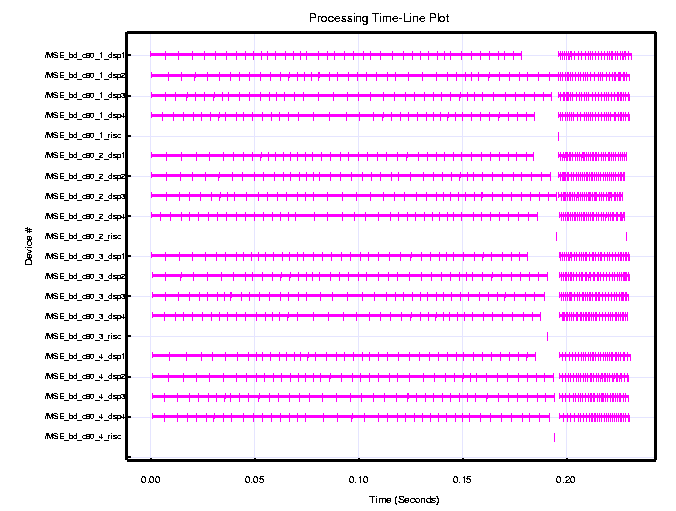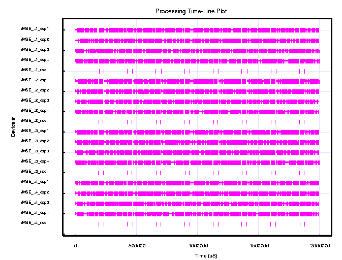The average processor utilization across all 16 DSPs is 94.383%, which was quite highly efficient. This is due to the highly repetitive nature of the MSE algorithm and relatively low bus activity.