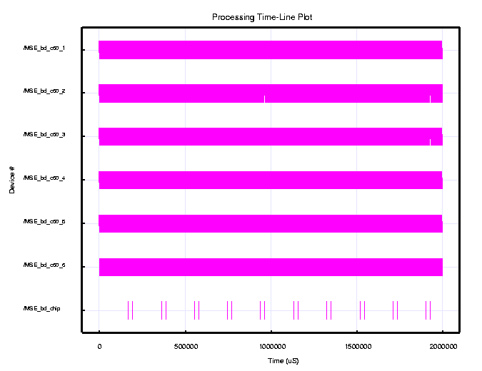 Figure 9 shows the simulation timeline results for the C6201 custom board virtual prototype for a two second simulation. The timelines show the C6201s processing the low resolution for the first 168 ms, followed by the high resolution computations that take approximately 25 ms. The six C6201 DSPs repeat this process continuously. Within the two second interval, each C6201 processes 10.33 image chips. As a result, the six c6201s on the custom board can sustain a 31 image chips/second throughput rate. The C6201 virtual prototype established that a single C6201 MSE board could meet the 30 image chips per second processing requirement with a 3% margin.