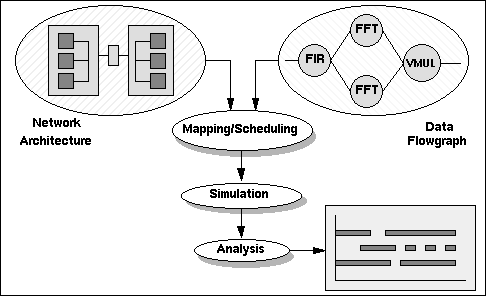 Cosmos performance models are made up of two major components: a hardware model (network architecture) and a software model (data flowgraph). The hardware and software models are defined independently and to the same level of detail. The independence of the models ensures a hardware architecture can be utilized with various software architectures and vice versa. Modeling both hardware and software at the same level of abstraction ensures that high-fidelity performance models are created and prevents hardware or software from dominating the model. Figure 1 shows how Cosmos' independent hardware and software models are merged, simulated and analyzed as a result of the mapping.