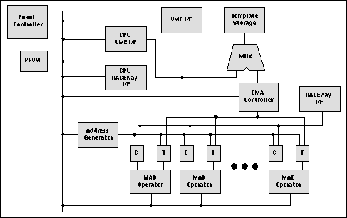 A graphical representation of the FPGA-based MSE Classifier custom board is shown below (see Figure 2). The classifier was made up of six FPGAs each accompanied by dual-ported template and chip caches, external VME and RACEway interfaces, a board control processor for dispatching the image chips, and global template memory to store the target templates for both the low and high resolution modes.