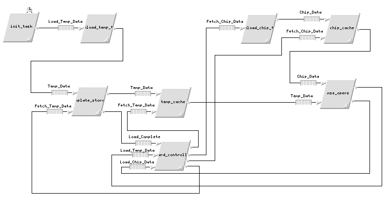 Cosmos' Software Designer enables engineers to capture the inter-task communications and define the lower level software descriptions using data flow graphs. To facilitate the MSE FPGA custom board model development, software tasks were used to mechanize the routing tokens throughout the model. As a result, unique software tasks had to be allocated for each processor element defined in the hardware architecture. Figure 6 shows the top-level software description in which all of the software tasks are defined including the inter-task communication paths.