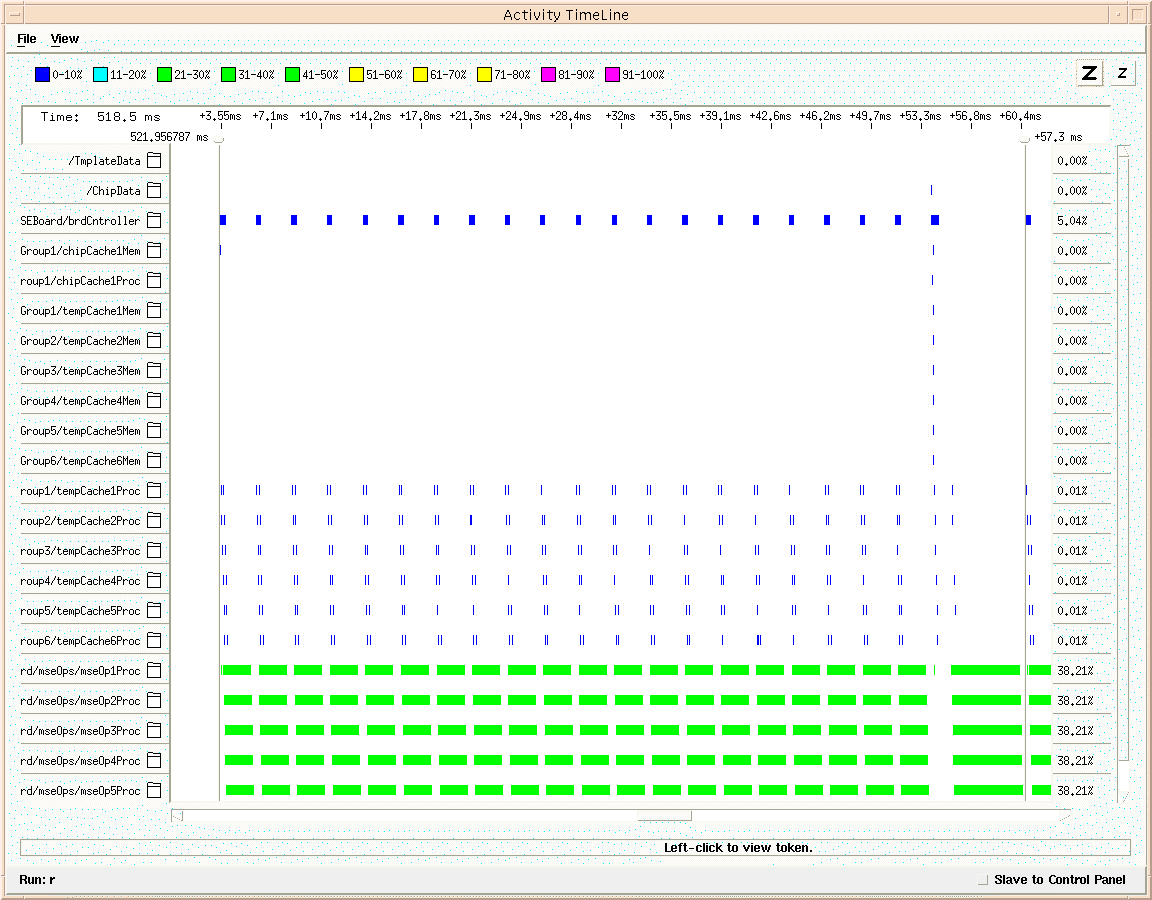 Cosmos provides the capability to import VHDL simulation transcript files to visualize the processor activity as a function of time. Analysis of the simulation results (see Figure 7) show it took 57 milliseconds to process one image chip for both the low and high resolution classification modes. As a result, a single board can process 17.5 image chips per second and two FPGA-based MSE/MAD Classifier boards would be needed to process the required 30 image chips per second. The processing throughput of the two board subsystem actually exceeds the system requirements by over 16 percent. It is appropriate to point out that the simulation results indicate that the FPGA-based MSE/MAD operators are inactive throughout the processing. This is attributed to the fact that the performance model's abstraction level is not down to the clock level, but rather at the block level. Summary