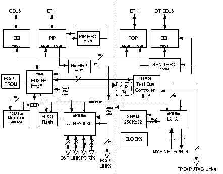 As well as the communications to the FPCAP modules via the LANai, a RISC processor that provides the interface between a Myrinet link (160 Mbytes per second bandwidth in each direction) and the SHARC External Processor Bus. Myrinet data being sent or received is buffered in the high-speed 128K LANai SRAM. A 128K-by-48 SRAM that can be accessed by either the SHARC or the LANai, a 512K-by-8 flash memory that boots the SHARC at power-up, a test bus controller for JTAG test of FPCAP modules, and two independent clock oscillators with clock buffers.