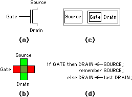 The use of advanced design components in a layout-level environment such as nMOS does not hinder the flexibility of circuits that can be built. Circuit and VLSI designers prefer to deal with such a set of primitives because it agrees with their connectivity-oriented view of circuitry. For mask designers, the transistor and contact primitives can be ignored so that design can be done solely with geometric components. However, many mask designers understand enough about circuitry to appreciate these higher-level primitives. In fact, some designers prefer to use cell libraries with even-higher-level primitives that perform complex circuit functions [Newkirk and Mathews]. All that is needed for any designer is a small but powerful set of components that produces correct layout while providing information relevant to the task at hand.