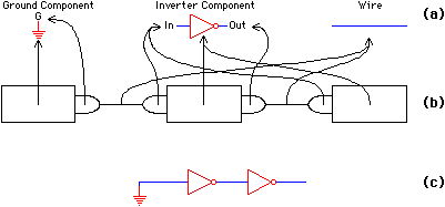 Given this uniform representation of hierarchy, every cell is a component prototype. In Fig. 3.8, the design of Fig. 3.6 is shown in its proper perspective as a complex prototype called "Bignothing." Note that the "Out" connection on the rightmost inverter component in "Bignothing" is exported and called "Final." Other cells may contain instances of the "Bignothing" cell, thus including its contents. The "Something" cell in Fig. 3.8(c) has two components: one that is a primitive component and one that has a complex prototype. The complete layout is shown at the bottom of the figure.