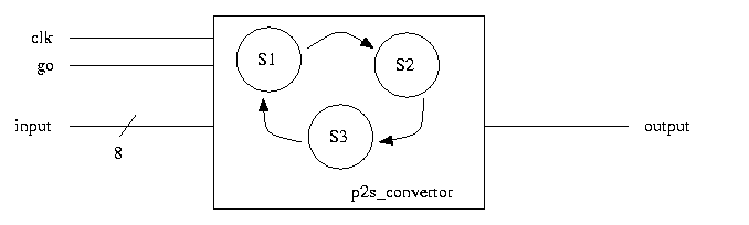 Your parallel to serial convertor works as follows. The machine should wait until the 'go' signal becomes active (high) and then transmit the data using the following protocol: The output should be kept high until it is going to send information on it. You must then send a start bit ('0') followed by the data going from high order to low order followed by a stop bit ('1'). There should be one bit transmitted per clock cycle. NOTE: The go signal should not be treated as an enable. It is simply used to tell your machine when to begin transmitting data.