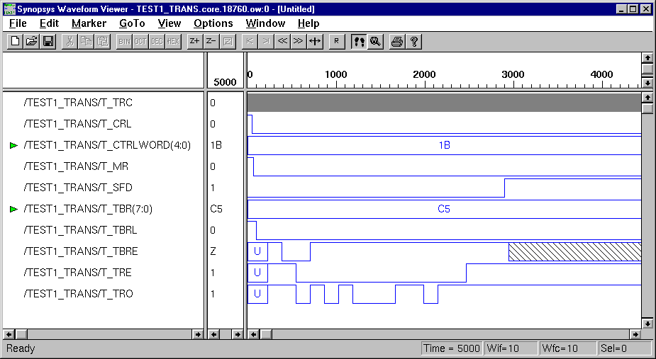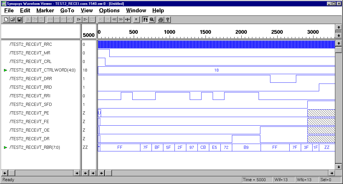 1 start, 1 stop, and no parity, (Data=01001 & 01110 & 00100, Control