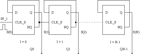 The for generation scheme is used to describe regular structures in the design. In such a case, the generation parameter and its scope of values are generated in similar way as in the sequential loop statement. Example 1 illustrates this concept with N-bit binary counter created by the generate statement that instantiates N D-type flip-flops (Figure 1).