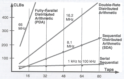 ÀÌ ±×¸²¿¡¼­ º¼ ¼ö ÀÖµíÀÌ °¡Àå È¿À²ÀûÀÎ FPGA ±¸ÇöÀº XCS30-3 FPGAÀÇ 68%, Áï, ¾à 1,500 °ÔÀÌÆ®¸¦ ÀÌ¿ëÇϰí ÀÖ´Ù[1]. ÀÌ ±¸ÇöÀº ´ÜÀÏ 50 MHz DSP º¸´Ù 2.6¹è ¿ì¼öÇÑ ¼º´ÉÀ» º¸À̰í ÀÖ´Ù. ÀÌ·¯ÇÑ È¿À²¼ºÀÇ ¿­¼è´Â SDA (Sequential Distributed Arithmetic) ¾Ë°í¸®ÁòÀÌ´Ù[2, 3]. ÀÌ ¾Ë°í¸®ÁòÀº XCS30 ¾ÆÅ°ÅØÃ³ÀÇ Æ¯Â¡À» ÀÌ¿ëÇÑ´Ù. Multiply ÇÔ¼ö´Â FPGAÀÇ Æã¼Ç Á¦³Ê·¹ÀÌÅÍ¿¡ ¸ÅÇεǸç, adder¿Í accumulator´Â XCS30 °í¼Ó ij¸® ·ÎÁ÷À» ÀÌ¿ëÇϰí, ½Ã¸®¾ó ½ÃÇÁÆ® ·¹Áö½ºÅÍ´Â È¿À²ÀûÀÎ ¿Â Ĩ ·¥¿¡ ±¸ÃàµÈ´Ù[4].