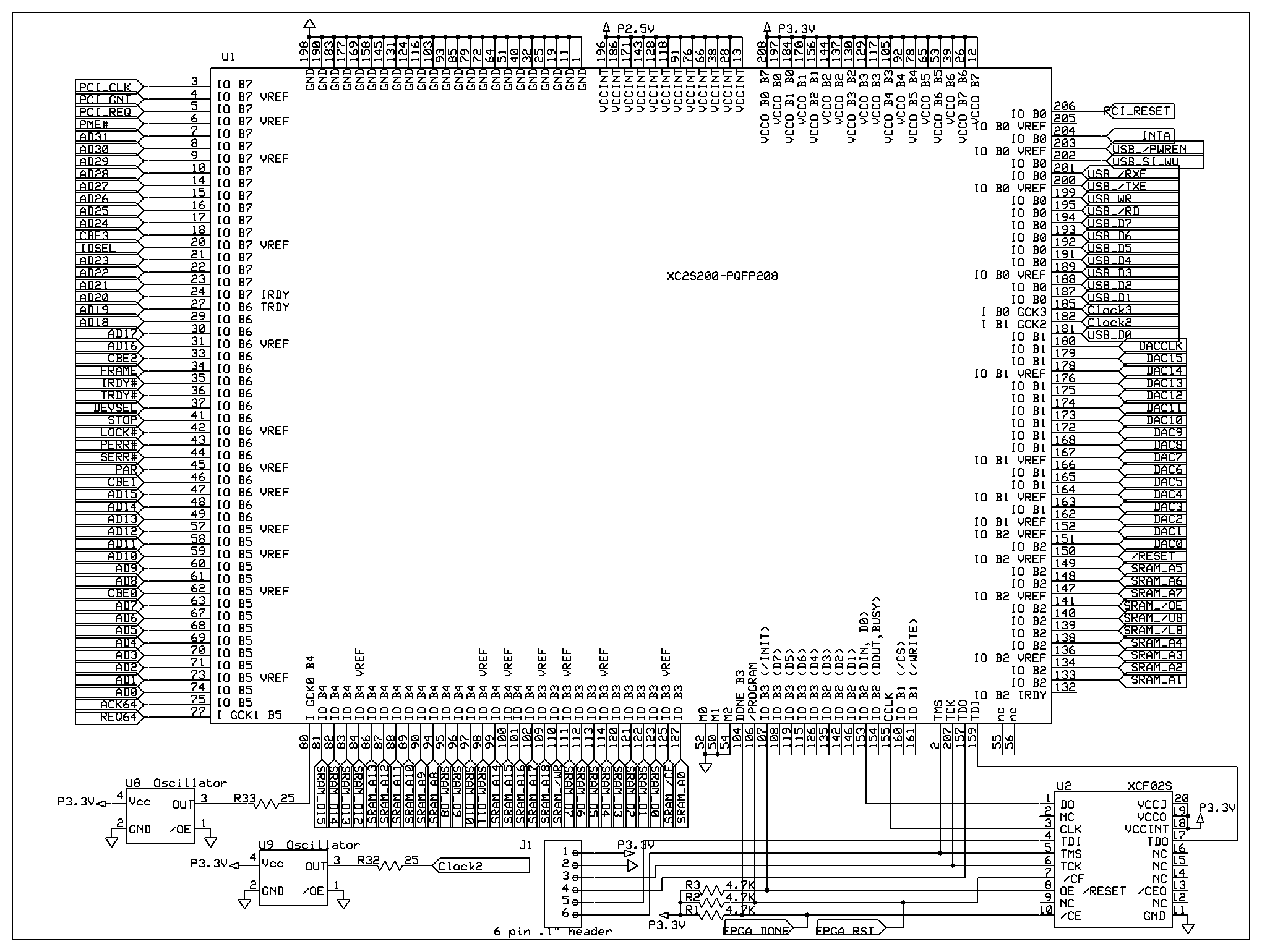 When I created the PCB, I wasn't sure which PCI signals were necessary, and I included too many. The DAC also uses too many lines. I designed the board with a 16-bit part in mind, but that was not available so I used the 12-bit version instead. With the noise from a common digital and analog ground plane, it is unlikely that the difference in resolution matters. The SRAM chip on one of my boards had bad address lines on data bits 5 and 6, so I swapped the lines with bits 0 and 1 in the .UCF pinout file. For real fun and games, replace the SRAM with DRAM.