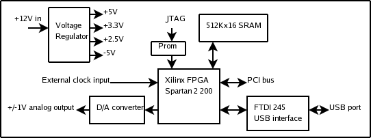 The output is one of the BNC connectors on the left side of the card, and the USB connector is below it. The card edge connector fits in a USB expansion connector as a 5/3.3V universal device. External power can be connected to the jack on the top right of the board.