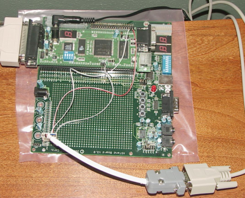 The upgrade was easy. Using available power supplied on the XStend board, and input/output pins available on the fpga the interface was soldered into place in about an hour. Testing was done with the rs232 project available on this site. This upgrade allowed me to run the Micro8 design available at John Kent's fpga site (see references and projects for XSA version of his project).