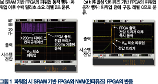 그림 1의 NVM(안티 퓨즈) FPGA AX250 I/O는 시스템에 전원이 인가되기 전에 작동한다. SRAM FPGA XC3S200의 경우, 부품이 컨피규레이션 파일을 다운로드 하여 I/O 동작을 시작하는데 200ms 이상이 걸린다. NVM FPGA는 레벨 0 LAPU로 분류되며, 레벨 2 LAPU로 분류되는 SRAM FPGA보다 일반적으로 4,000배 정도 빠르다.