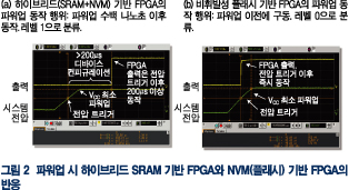 그림 2의 NVM(플래시) FPGA A3PE600 I/O는 시스템 파워업 이전에 작동하며, 하이브리드 SRAM FPGA EPM1270의 경우, 컨피규레이션 파일 로딩과 작동 시작까지 200µs 정도가 걸린다.