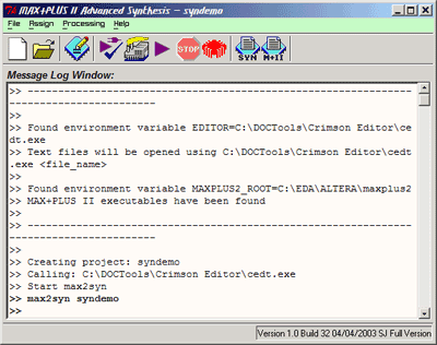 ÀÌ S/W¿¡¼ »ý¼ºÇÏ´Â °á°ú¹°Àº ¿©Å¸ 3rd-party ÇÕ¼ºÅøµé°ú ¸¶Âù°¡Áö·Î EDIF FormatÀÇ NetlistÀÔ´Ï´Ù... ºÎ¼öÀûÀ¸·Î MAX+PLUS II¿Í MAX+PLUS II BASELINE¿¡¼ ¹Ù·Î CompileÀ» ÇÒ ¼ö ÀÖµµ·Ï °ü·Ã ºÎ¼ÓÆÄÀÏ (*.ACF¿Í *.LMFµî)µéµµ °°ÀÌ »ý¼ºÀ» ÇØÁÖ´Â ÀåÁ¡µµ ÀÖ½À´Ï´Ù... GUI ¹æ½ÄÀ¸·Î º» S/W¸¦ »ç¿ëÇϸé ÀÌ S/Wâ³»¿¡¼ MAX+PLUS II¸¦ È£ÃâÇÏ¿© Background Process¸¦ ÅëÇØ HDL CodingºÎÅÍ *.POF/SOF »ý¼º´Ü°è±îÁöµµ Çѹø¿¡ ½ÇÇà½Ãų ¼ö ÀÖ´Â ±â´ÉÀÌ Áö¿øµË´Ï´Ù... ¹°·Ð MAX+PLUS II¸¦ Foreground·Î È£ÃâÇÏ¿© ±âÁ¸Ã³·³ »ç¿ëÇÏ´Â ¹æ½Äµµ Áö¿øÇÕ´Ï´Ù...