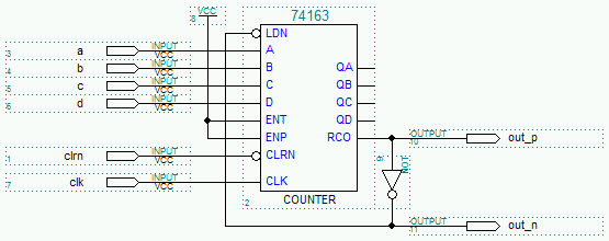 LIBRARY ieee; USE ieee.std_logic_1164.ALL; LIBRARY altera; USE altera.maxplus2.ALL; ENTITY sn74ls163 IS PORT (clk, clrn, d, c, b, a : IN STD_LOGIC; out_p, out_n : OUT STD_LOGIC); END sn74ls163; ARCHITECTURE arch_sn74ls163 OF sn74ls163 IS SIGNAL vcc, rco_p, rco_n : STD_LOGIC; BEGIN freqdiv: a_74163 PORT MAP ( clk=>clk, ldn=>rco_n, clrn=>clrn, enp=>vcc, ent=>vcc, d=>d, c=>c, b=>b, a=>a, rco=>rco_p); vcc <= '1'; rco_n <= NOT rco_p; out_p <= rco_p; out_n <= rco_n; END arch_sn74ls163;