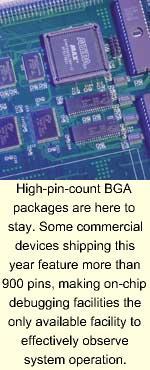 Chip pins have always given engineers something to look at when debugging their systems. On boards full of SSI logic, an engineer could literally trace a problem back through logic, gate-by-gate, with just an oscilloscope probe, and find a problem's origin. Even with high-gate-count chips, a great deal of debugging is accomplished just by probing inputs and outputs. But with BGA packages, there's often, literally, no place to hang a scope probe. Although some device pins can be connected to pc-board test points, this is only practical for a small minority of the pins on a large BGA device. Test points are obviously useful, and traditional scopes and logic analyzers will be with us a long time. But naturally, test points usually represent signals that a logic designer expects to look at. And bugs, by their very nature, inevitably arise where you don't expect them. So, more frequently, you're going to find yourself with a board in one hand, a scope probe in the other, and no way to make them work together.